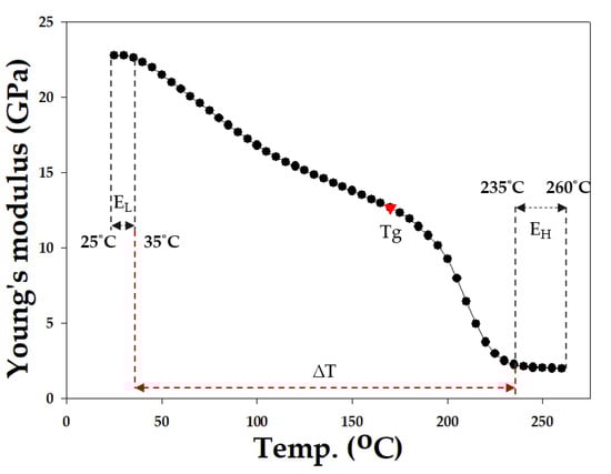 In this study, in addition to using the aforementioned EMC, the material properties of EMC were further modified to observe their effects on wafer warpage. Based on a literature review of EMC material parameters [1,2,3,4,5,6,8,15,16], the upper and lower limits of adjustable material values were summarized and organized as shown in Table 4. The range of modulation of Young’s modulus was defined in the study as the temperature interval before and after the Tg point of the EMC, named the temperature interval EL (from 25 °C to 35 °C) and EH (from 235 °C to 260 °C), respectively, with ∆T as the temperature interval between EL and EH (as shown in Figure 7). The thermal expansion coefficients before and after the Tg point were denoted as α1 and α2, respectively. All parameters were adjusted within the ranges specified in Table 4 to analyze the effects of changes in the material properties of the epoxy molding compound on wafer warpage.