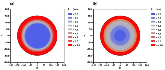 Before establishing the criteria for suitable epoxy molding compound material properties, it was necessary to verify the accuracy of the model developed in this study by comparing the results of wafer warpage calculations with experimental results. Table 5 shows the comparison between the calculated wafer warpage values of the model in this study and the experimental values, and Figure 8 presents the comparison between the simulated results and experimental values of the maximum wafer warpage during the decarrier process. Based on the analysis results, the wafer warpage trend is consistent with the experimental results, exhibiting a concave shape, and the error between the simulation and experimental values is only 0.15%. Therefore, the feasibility of the wafer warpage evaluation model for fan-out type packaging established in this study is demonstrated by the results.