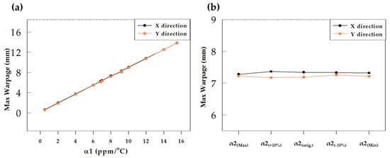 Warpage results of CTE based on modulating (a) α1 and (b) α2.