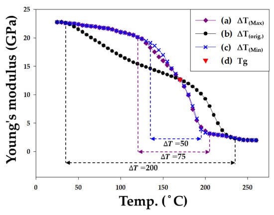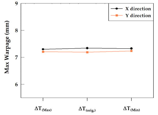 The values of the parameter ∆T and their corresponding wafer warpage are presented in Table 9. Varying ∆T causes significant changes in the values of Young’s modulus curve between EL and EH, but EL and EH remain unchanged. Young’s modulus curve after the adjustment is shown in Figure 14. Based on the results (Table 9 and Figure 15), it can be concluded that the variation in ∆T of the EMC has a very minor effect on wafer warpage within the range discussed: the extent of the impact is within 1% of the wafer warpage range.