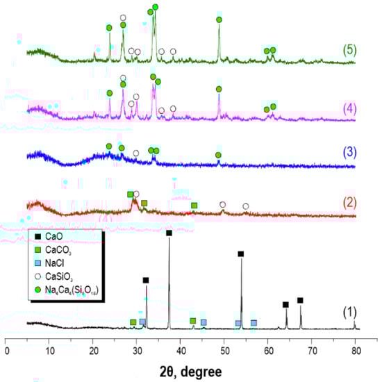 According to XRF data, after thermal-oxidative treatment of the sea urchin skeleton at 800 °C, the material composition includes two main crystal phases of CaO and CaCO3, as well as a small amount of NaCl impurity (Figure 1, curve 1). The presence of sodium chloride as an impurity is explained by the sample preparation of the sea urchin. After microwave treatment of the sea urchin skeleton, the sample is saturated with Na2SiO3 solution at 180 °C and 30 min of exposure, and the sample composition becomes a mixture of CaCO3 and crystal wollastonite CaSiO3 (Figure 1, curve 2). When the time of exposure in microwave heating conditions increases up to 60 min, the composition of the obtained sample, along with the crystal wollastonite CaSiO3 phase of sodium calcium aluminosilicate Na4Ca4(Si6O18) of combeite structure, is formed, and CaCO3 is absent (Figure 1, curve 3). The subsequent thermal-oxidative treatment of the synthesized materials is accompanied by an increase in the degree of crystallinity of CaSiO3 wollastonite and Na4Ca4(Si6O18) combeite, as evidenced by the increased intensity of the diffraction maxima (Figure 1, curves 4 and 5).