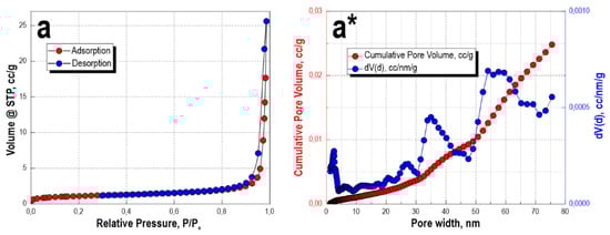 The low-temperature sorption-desorption isotherm of nitrogen, for the sample obtained after microwave heating for 60 min and subsequent thermal oxidation treatment, corresponds more to type II, according to the IUPAC classification. This type of isotherm is characteristic of nonporous or macroporous materials of corpuscular structure, wherein the shape and size of pores are heterogeneous (Figure 3a). The isotherm has insignificant sorption hysteresis, which also allows it to be compared with type IV isotherms. This indicates the presence of a small number of micro- and mesopores. This is confirmed by DFT simulation data (Figure 3a*), where it is shown that a pore volume of 0–10 nm corresponds to −0.01 cc/g, a pore volume of 25 nm corresponds to 0.005 cc/g, and 35 nm corresponds to 0.015 cc/g. The main pore volume for this sample lies in the range 50–60 nm—0.02 cc/g; the insignificant presence of micro- and mesopores is present, but without their narrow size distribution. The specific surface area of the sample is 3.7 m2/g. Obviously, the bulk of the porous volume belongs to the macropores larger than 100 nm, which are characteristic of the sea urchin skeleton structure and cannot be determined by this method.