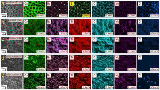 Qualitative and quantitative EDS analysis (Figure 5) established that the composition of samples included the main elements Ca, O, Si, Na, Mg, evenly distributed on the locally investigated surface. Besides, it contained Mg, Cl, and S in insignificant amounts. The presence of these elements in the sea urchin skeleton is determined by its mineral nature. The exception is Si, which is introduced in the composition synthesis as a part of precursors, according to Equation (1), similarly to Na. These elements represent the basis of the composition of the obtained composite material, wollastonite and combeite phases. The results were confirmed by XRF, shown above (Figure 1 and Figure 2). The quantitative ratio of Ca, Na, Si, and O, in all synthesized samples, corresponds to the newly formed wollastonite and combeite phases.