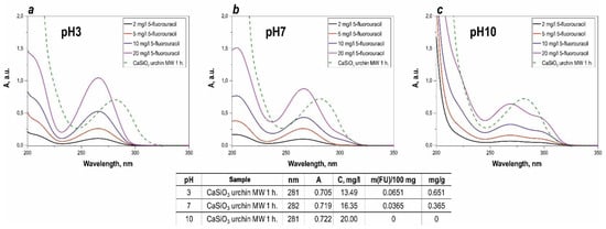 Light absorption spectra of the calibration solutions, and of the solution in the presence of the synthesized calcium silicate composite material at different pH ((a)—pH = 3, (b)—pH = 7, (c)—pH = 10), specially added table to study sorption values of 5-FU in more detail.