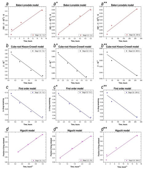 Analysis of drug release kinetics. (a–a**)—application of the Baker-Lonsdale model to both stages of the 5-fluorouracil release profile; (b–b**)—application of the Hixson-Crowell model to both stages of the 5-fluorouracil release profile; (c–c**)—application of the first-order model to both stages of the 5-fluorouracil release profile; (d–d**)—application of the Higuchi model to both stages of the 5-fluorouracil release profile.