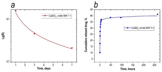 As can be seen in Figure 9b, at pH = 5, a large proportion of the drug was released during the first hour, with 27% of 5-fluorouracil being released (Figure 9b). During the next 3 h, drug release continued at a slower rate, with an additional 9% desorbed. The analytical signal of 5-fluorouracil was fixed for up to 11 days. We assumed that the drug release continued for a longer period of time, but the recording of the 5-fluorouracil content in the sample was limited by the instrumentation available in the laboratory. Thus, the total percentage of 5-fluorouracil leached from the inorganic matrix was 41%, or 0.267 mg/g.
