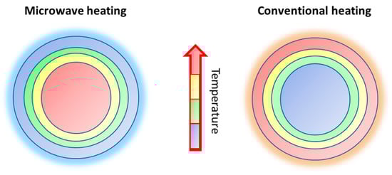 As sketched in the scheme of Figure 1, microwave irradiation generates heat within the material and throughout its entire mass simultaneously, as this excitation process results in a consistent and uniform heating of the material, leading to a rapid and homogenous increase in temperature.