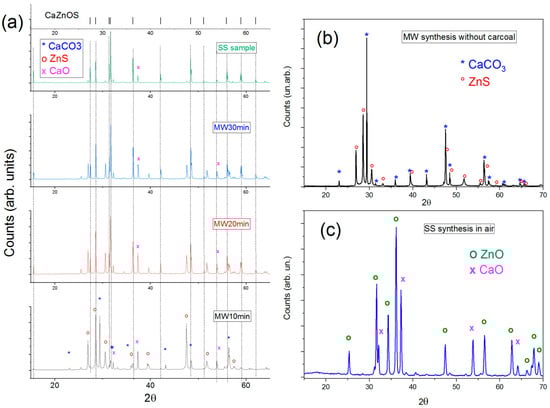 The presence of CaO can be strictly related to the chamber atmosphere. It was already observed that a reducing atmosphere is strictly required for the formation of CaZnOS, while the growth in air generates only oxides. In the MAS process, the reducing atmosphere is provided by the high percentage of CO generated by the thermal effect of the charcoal present in the outer crucible [20]. In the absence of charcoal, the CaZnOS structure was not formed, both for the presence of a not-reducing atmosphere (in the SS synthesis in air, only CaO and ZnS are formed) and also for the lower temperature of the starting precursor (Figure 3b,c).