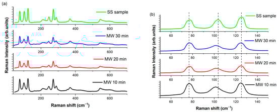 Three main bands are clearly visible in the Raman spectra of the samples (Figure 4b), corresponding to the two E2 modes at 75 and 102 cm−1 and the E1 mode at 125 cm−1. It is noteworthy that these bands remain centered at the same Raman frequency and show no significant variations in their width, as can be seen when comparing the spectra of the samples grown by MAS and the SS synthesis method.