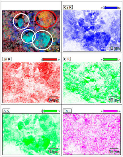The elemental distribution obtained from the EDAX measurements can give an important indication and proof of local inhomogeneities. Even if the CaZnOS structure is the predominant phase, a deep analysis permits us to find some aggregates of different structures. Figure 5 shows the presence of inhomogeneous zones with clusters of Ca and S (the most probable is CaS—white circle), and Zn and S (ZnS—red circle). However, the presence of CaS was relatively low (under the detection limit of the XRD results) and the inhomogeneities are restricted to a limited number of zones.