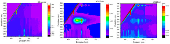 3D-plot of the excitation and emission spectra for SS samples, MW10 min, and MW20 min samples.