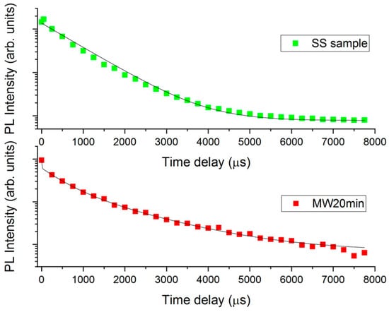where I(t) is the time-dependent photoluminescence intensity and T is the duration of the time window (8 ms in our case, or can be considered infinite in a more general case). The value of the average lifetime for the MW20 min and MW30 min samples is 769 μs and 750 μs, respectively.