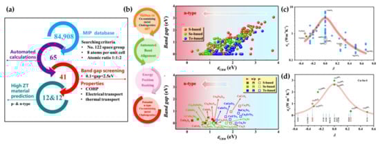 - Xiong, Y.F.; Jin, Y.Q.; Deng, T.T.; Mei, K.L.; Qiu, P.F.; Xi, L.L.; Zhou, Z.Y.; Yang, J.; Shi, X.; Chen, L.D. High-Throughput Screening for Thermoelectric Semiconductors with Desired Conduction Types by Energy Positions of Band Edges. J. Am. Chem. Soc. 2022, 144, 8030–8037. [Google Scholar] [CrossRef]
