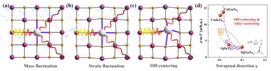 - Xie, H.Y.; Li, Z.; Liu, Y.; Zhang, Y.K.; Uher, C.; Dravid, V.P.; Wolverton, C.; Kanatzidis, M.G. Silver Atom Off-Centering in Diamondoid Solid Solutions Causes Crystallographic Distortion and Suppresses Lattice Thermal Conductivity. J. Am. Chem. Soc. 2023, 145, 3211–3220. [Google Scholar] [CrossRef]
