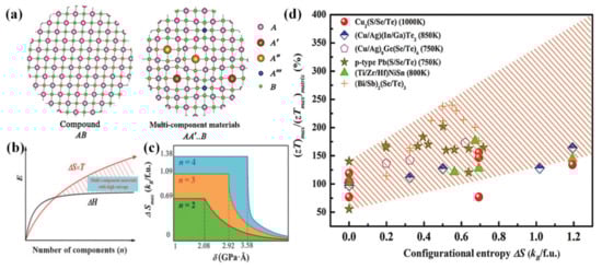 - Liu, R.H.; Chen, H.Y.; Zhao, K.P.; Qin, Y.T.; Jiang, B.B.; Zhang, T.S.; Sha, G.; Shi, X.; Uher, C.; Zhang, W.Q.; et al. Entropy as a Gene-Like Performance Indicator Promoting Thermoelectric Materials. Adv. Mater. 2017, 29, 1702712. [Google Scholar] [CrossRef]