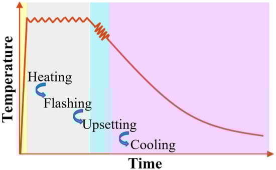 As an important classification of resistance welding technology, flash butt welding (FBW) has been extensively applied in industry, such as in building railway tracks and oil/gas pipelines. For instance, in railway tracks, the FBW is applied for joining tracks with high efficiency and quality [6,7,8,9]. During flash butt welding, the contact surfaces of a pair of workpieces are heated with a rapid heating rate until they melt and join by the existing forces. This is a flashing process. After that, the workpieces are pressed by the axial displacement of the electrodes, in order to extrude the impurities out from the melted surfaces. This is the upsetting process [10]. In the FBW process, the upsetting process plays a role in forging, which can provide good mechanical performance for the joint. Therefore, FBW is an efficient welding process, and is regarded as a combination of high heat input and extra forging. Furthermore, the FBW process does not need any consumables, which can save money in mass production and processing [11,12,13].