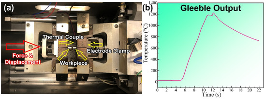(a) Gleeble 3500 system at UOW. (b) Temperature–time curve captured in a FBW Gleeble simulation.