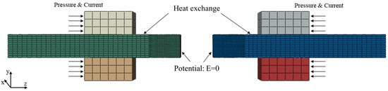 The load and boundary conditions are listed in Table 3. The load was electrode voltage (220 V) and the given boundary condition was zero potential on the contact surface (Figure 3). The heat transfer through the contact surface between the electrode and workpiece was set to be the thermal conduction mode. The heat exchange coefficient between the workpiece surface and air was assumed to be constant at 3800 W/m2∙°C. The initial temperature of the whole model was the ambient temperature (20 °C). The step time of finite element analysis was controlled by the thickness of the killed layer and the flash speed. The temperature after killing one layer of elements was set as the initial condition for the temperature calculation of the next layer of elements, and this process was continuously cycled until the flash process was finished.