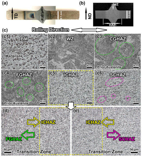 (a) Morphology of FBW-ed sample; (b) macrostructure of weld joint; (c) microstructure of the main heat-affected zones; (d) microstructure of the transition zone between FGHAZ and ICHAZ; (e) microstructure of the transition zone between ICHAZ and SCHAZ.