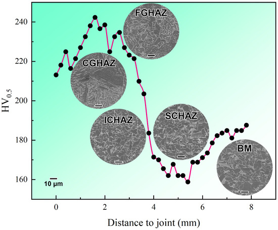 The zone of hardness is shown in Figure S2 (Supplementary Materials). The number of tested points in the CGHAZ, FGHAZ, ICHAZ and SCHAZ were 11, 6, 5, and 11, respectively. As shown in Figure 6, the average microhardness values of the different zones were: CGHAZ (232.7 HV0.5) > FGHAZ (225.8 HV0.5) > ICHAZ (187.7 HV0.5) > BM (184.2 HV0.5) > SCHAZ (167.2 HV0.5). There was a significant decline in the microhardness of the ICHAZ and SCHAZ compared with the CGHAZ and FGHAZ. In terms of the softening behaviour, the hardness of the SCHAZ decreased by 9.2% compared with BM, and the width was 1099.4 μm. The SCHAZ of the DP590 steel was defined to be the abnormal softening area, which needs to match the application requirement. As shown in Figure 5 and Figure 6, CGHAZ and FGHAZ had lamellar martensite structures, which can provide a high hardness. Compared with the CGHAZ and FGHAZ, there was an evident decrease in the hardness in the ICHAZ, which mainly had fine ferrite grains together with some remaining tempering martensite structures. The microstructure of the SCHAZ was very similar to the BM. However, the martensite in the SCHAZ exhibited a characteristic tempering, which is the reason why softening occurred in the SCHAZ.