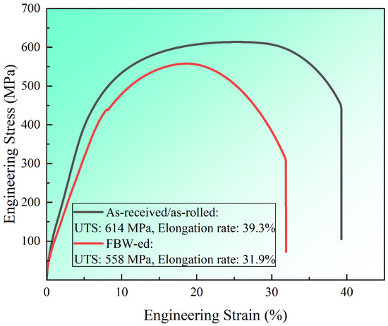 Engineering stress–strain curves of as-received and as-FBW-ed DP590 steel.