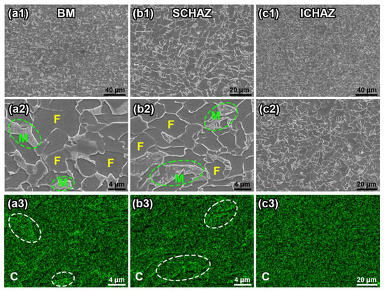 SEM and EDS results of different zones: (a1–a3) BM; (b1–b3) SCHAZ; (c1–c3) ICHAZ.