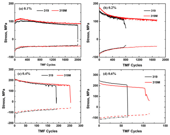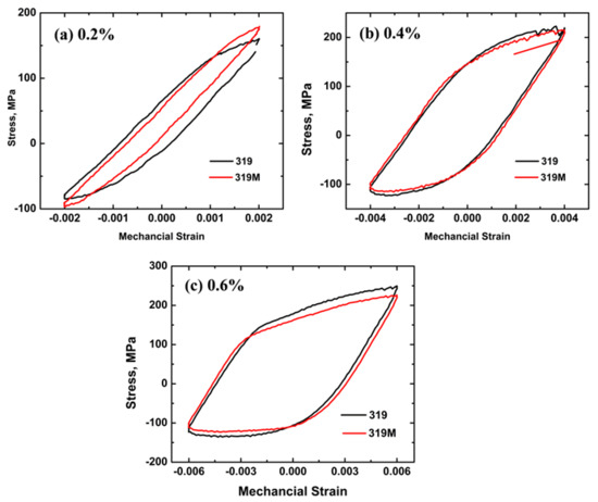 However, as shown in Figure 4b, the hysteresis loops of the two alloys at a strain amplitude of 0.4% almost overlapped, indicating similar maximum tensile/compressive stresses for both alloys. Furthermore, the maximum tensile/compressive stress in 319M at a strain amplitude of 0.6% was lower than that in 319 (Figure 4c). The reason for this is the different number of cycles in the pre-tests. As mentioned in the experimental section, to measure the thermal strain and adjust the zero stress, thermal cycling in the temperature range of 60–300 °C was necessary, which could be considered as an “over-aging” process for θ’ precipitates. Table 3 lists the number of cycles of the pre-test and the maximum tensile stress of the second cycle under various strain amplitudes. The number of cycles for the pre-tests at the strain amplitudes of 0.1 and 0.2% was similar for both alloys (approximately 27–29 cycles), indicating a similar “over-aging” process. Therefore, the maximum tensile stress of 319M at the strain amplitudes of 0.1 and 0.2% was higher than that of 319. However, the number of cycles of the pre-test for 319M at a 0.4% strain amplitude was higher than that of 319 (31 and 26, respectively), and significantly higher at a 0.6% strain amplitude (39 and 28, respectively), which resulted in a longer “over-aging” process in 319M, and hence, the lower tensile stress when the TMF tests started.