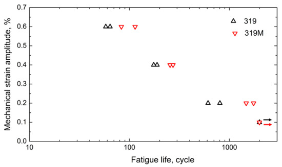 Figure 6 shows the TMF lifetimes of experimental alloys under different strain amplitudes. Generally, the total fatigue life decreases with an increasing strain amplitude. However, the fatigue life of 319M was always longer than that of 319. As shown in Figure 6, the fatigue lives of both alloys exceeded the 2000 cycle limit at a 0.1% strain amplitude; however, the difference became obvious starting at the 0.2% strain amplitude. The average TMF life for 319 at a 0.2% strain amplitude was 708 cycles, which more than doubled to 1611 cycles for 319M. The average TMF lives of 319 and 319M at the strain amplitudes of 0.4 and 0.6% were 182 and 264 cycles, and 61 and 98 cycles, respectively, which are improvements of 46% at 0.4% and 61% at 0.6% in 319M, as compared with 319. It is apparent that the microalloying with Mo significantly improved the TMF resistance of 319 alloys.