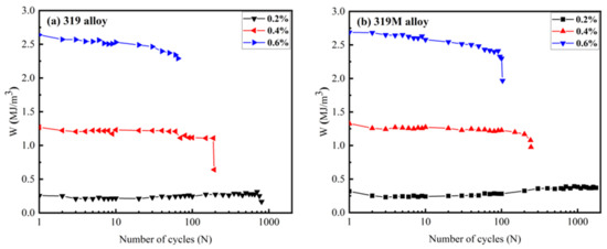 where Wi denotes the hysteresis energy of the ith cycle. Figure 8 shows the hysteresis energy (W, equal to the hysteresis loop area fraction) as a function of the number of cycles for both 319 and 319M. The hysteresis energy stabilized and saturated after several cycles at the applied strain amplitudes. Therefore, the saturation hysteresis energy could be easily estimated from the initial few cycles.