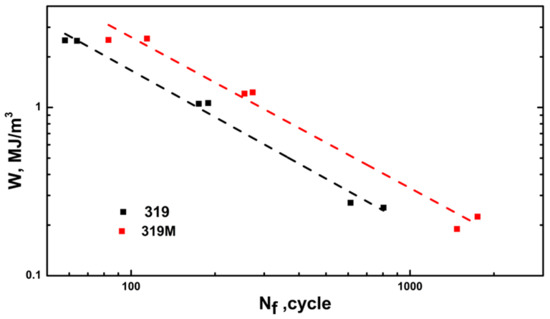 Based on the experimental data of the fatigue life in Figure 6 and the saturated hysteresis energy (Ws) in Figure 8, their relationship is shown in Figure 9 on a log-log scale, and the calculated W0 and β values are listed in Table 6. The slopes of the fitting curves for 319 and 319M were similar, indicating similar β values for both alloys. As shown in Table 6, β was calculated to be 1.09 and 1.07 for 319 and 319M, respectively, indicating similar decreasing TMF cycles with hysteresis energy. However, the intersections of the fitting curves with the Y-axis for the two alloys, from which W0 was calculated, were considerably different. As shown in Table 6, the W0 of 319M was 201, which is significantly higher than the 108 of 319, indicating the high fatigue damage capacity of 319M, hence the enhanced TMF resistance.