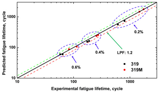 The predicted fatigue lifetimes of the two alloys were calculated using Equation (3) and the material parameters (W0 and β) in Table 6. The life prediction factor (LPF), which is defined as the ratio of the predicted life to the experimental life, is often used to evaluate the applicability of prediction models. Figure 10 shows the predicted and experimental TMF lifetimes for the two alloys with relatively low LPF (approximately 1.2). The results demonstrate that the predicted lifetimes agree well with the experimentally measured ones, confirming that the energy-based model is applicable for predicting the TMF lifetime of Al-Si-Cu 319 alloys. Using this prediction, the TMF lifetimes of 319 and 319M under a 0.1% strain amplitude were estimated to be 4152 and 7382 cycles, respectively, both were remarkably longer than those of the non-fractured samples tested for 2000 cycles.