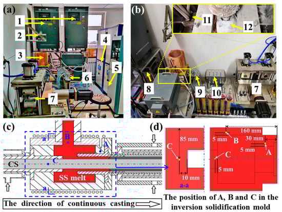 The HCLSCC equipment (a,b) and sectional drawing of inversion solidification mold (c,d). (a) The main view of the HCLSCC equipment; (b) the view of the HCLSCC equipment along the continuous casting direction; (c) the plane diagram of the inversion solidification mold; (d) the location of temperature measurement points in the inversion solidification mold (In (c) and (d), A, B and C are the locations of temperature measurement points, and “a” in (C) is section “a-a” in (d)). The description of the equipment: 1-heating power; 2-lifting and pulling device; 3-crucible; 4-water chilling unit; 5-control unit; 6-cooling water control; 7-traction device; 8-guided position device; 9-copper cooler; 10-cooling device; 11-substrate plate cooling device; 12-inversion solidification mold.