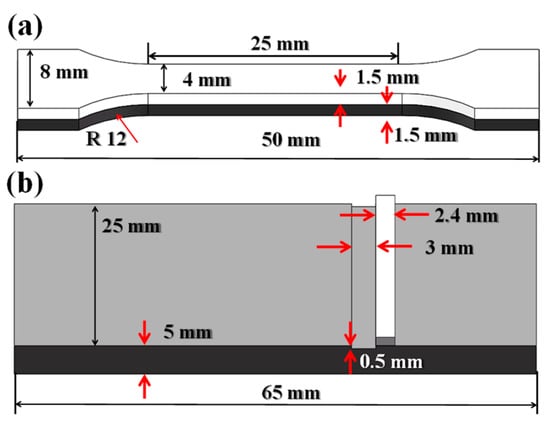 The dimensions of the tensile and shear strength specimens: (a) tensile strength specimens; (b) shear strength specimens. (The two opposite red arrows represent the size of the distance between them).