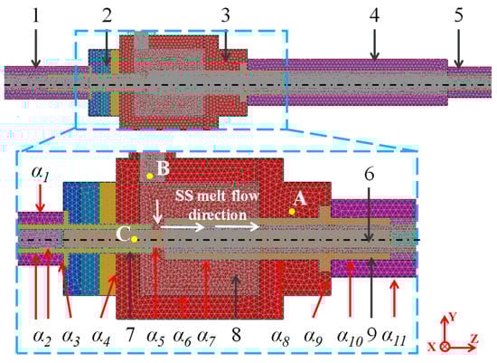 Geometric model of HCLSCC and the location of temperature measurement points(α1–α11 represents the heat transfer coefficient of the contact surface of each structure of the equipment, and A, B and C are the location of temperature measurement in the HCLSCC process): 1-substrate plate cooling device; 2-heat insulation device; 3-inversion solidification mold; 4-copper cooler; 5-cooling device; 6-CS substrate plate; 7-back connection structure; 8- SS melt; 9-front connection structure.