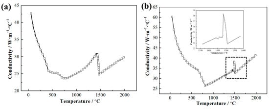 The geometric model of the HCLSCC process was established to analyze the effect of the continuous casting process on the cladding interface during the composite process. The geometric model of the HCLSCC process and the locations of temperature measurement points A, B, and C are shown in Figure 3. The length of the CS substrate was 1000 mm, and the grid size was 2.5 mm. The length of the SS cladding layer was 760 mm, and the grid size was 1 mm. The grid size of the substrate plate cooling device and the copper cooler was 2.5 mm, and the grid size of other structures was 5 mm. The points A, B, and C were temperature measurement points, and temperature control was performed on point A. Due to the short filling time, the filling process was ignored. The thermo-physical characteristics of the SS and CS were calculated by the simulation software according to the elemental content in Table 1. The thermal conductivity of the SS and CS are shown in Figure 4. The thermo-physical characteristics of the SS and CS are shown in Table 3.
