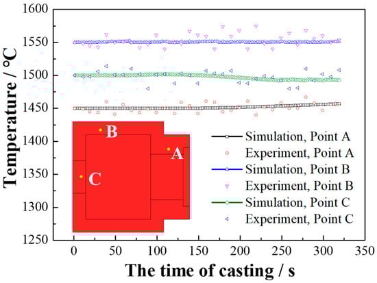 Figure 5 displays the results of the experiments conducted according to the process described in Section 2.1 in order to verify the accuracy of the 3D model of the HCLSCC process. Comparing the simulated and measured temperature changes at points A, B, and C, the measured temperatures fluctuated around the simulated temperatures with average errors of 0.42%, 0.52%, and 0.43%, respectively, and maximum errors of 0.96%, 1.61%, and 1.42%, respectively. Therefore, the results of the simulation were in good agreement with the measurements.