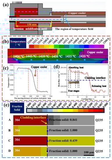 The simulation results during the HCLSCC process: (a) the extraction region of the temperature field; (b) the temperature field in the inversion solidification mold during the HCLSCC process; (c) the change in interfacial temperature; (d) the interfacial heat flux; (e) the solid phase distribution in the regions A, B, C, and D during the HCLSCC process.