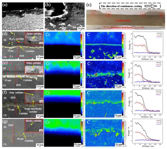 The microstructure and element distribution at the cladding interface: (a,b) the microstructure of CS; (c) the morphology of the cladding layer; (d–g) the morphology and element distribution of interfacial carbides in the regions A, B, C, and D.