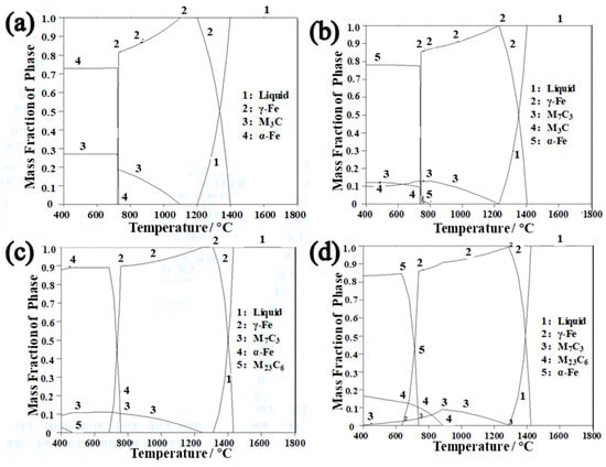 Figure 8 shows the results of the thermodynamic calculations at regions A, B, C, and D, which aligned with the chemical composition of the cladding interface in Table 5. The formation mechanism of the interfacial carbides was analyzed by thermodynamic calculations in Figure 8, revealing that the Cr content of the A region was low, the M3C carbides precipitated in the austenite at 1097 °C, and the cladding interface consisted of ferrite and M3C carbides (Figure 8a). The Cr content of the B region increased, the M7C3 carbides precipitated in the austenite at 1223 °C, the cladding interface consisted of ferrite, M3C, and M7C3 carbides at room temperature (Figure 8b), and the width of the carbides increased. The Cr content of the C region increased, the M7C3 carbides precipitated in the austenite at 1243 °C, the M7C3→M23C6 transformation occurred at 469 °C, and a core(M7C3)–shell(M23C6) structure was formed (Figure 8c). The Cr content of the D region increased, the M7C3 carbides precipitated in the austenite at 1289 °C, and the M7C3→M23C6 transformation occurred at 886 °C (Figure 8d). The higher interfacial temperature led to the diffusion coefficient increasing and accelerated spheroidization of the carbides. The C gathered laterally in the place where the curvature radius of the carbides was large, so growth of the carbides was promoted laterally (Figure 8d), but they gradually dissolved in the place where the curvature radius was small [25], forming granular and blocky carbides.