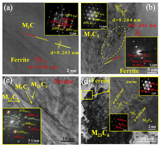 Figure 9 displays the microstructure of the carbides and relationship between the interfacial carbides and the interfacial ferrite matrix in the regions A, B, C, and D. The crystallographic relationships between the interfacial carbides and the interfacial ferrite matrix in regions A, B, C, and D were [−1211]M3C∥[00−2]α-Fe, (210)M3C∥(1−10)α-Fe, dM3C = 0.203 nm, dα-Fe = 0.201 nm (Figure 8a); [01−1]M7C3∥[−113]α-Fe, (600)M7C3∥(110)α-Fe, dM7C3 = 0.204 nm, dα-Fe = 0.202 nm (Figure 8b); [−11−1]M7C3∥[−110]M23C6∥[−011]α-Fe, (132)M7C3∥(01−2)α-Fe, (660)M7C3∥(−200)α-Fe (Figure 8c); [1−11]M23C6∥[−111]α-Fe, (440)M23C6∥(110)α-Fe, (40−4)M23C6∥(110)α-Fe, dM23C6 = 0.203 nm, dα-Fe = 0.202 nm (Figure 8d), respectively. The lattice misfit δ of the interfacial carbide and interfacial ferrite matrix could be calculated by Equation (11) [27]: