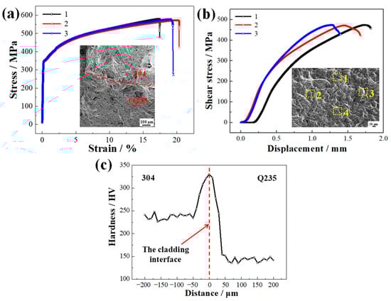 Figure 10 displays the tensile strength, interfacial shear strength, and micro-hardness near the cladding interface of the SS/CS clad plates with blocky M23C6 carbides formed at the cladding interface. Curves 1, 2, and 3 in Figure 10a are the stress–strain curves of different specimens under the same process. Curves 1, 2, and 3 in Figure 10b are the shear strain–displacement curves of different specimens under the same process. As shown in Figure 10a, the yield and tensile strengths were 381 and 577 MPa, respectively. As shown in Figure 10b, the interfacial tensile shear strength was 473 MPa, and the regions of 1-4 is the scanning area of EDS in (b). The interfacial tensile shear strength of the SS/CS clad plates prepared by vacuum welding hot rolling with a rolling temperature of 1150 °C and rolling reduction of 80% was 389 MPa [2]. The cladding interface tensile shear strength of the clad plates prepared by HCLSCC was similar to the clad plates prepared by vacuum welding hot rolling. Combined with the fracture morphology, the tensile fracture was ductile with a large number of dimples, and the cladding and substrate layers were not delaminated, which further illustrated that limiting the precipitation of carbides in the carburized layer could limit the formation of cracks and improve the strength of the clad plate. At the same time, according to the compression–shear fracture morphology, the fracture occurred on the CS near-interface, with large numbers of tearing edges and dimples, which significantly improved the interfacial bonding strength. Figure 10c shows the hardness distribution of the cladding interface. The maximum hardness at the cladding interface was 330 HV. The hardness gradually decreased from this point to the SS and CS. The average hardness values of the SS and CS were 237 HV and 143 HV, respectively.