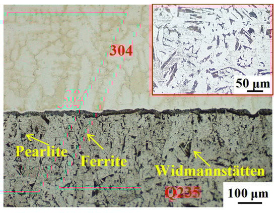 As shown in Table 1, the chemical composition of 304 SS and Q235 CS was accurately analyzed by spectroscope. The 304 SS was used for the cladding layer (thickness of 4 mm) and the Q235 CS, with a section of 40 mm × 15 mm, was used for the substrate.