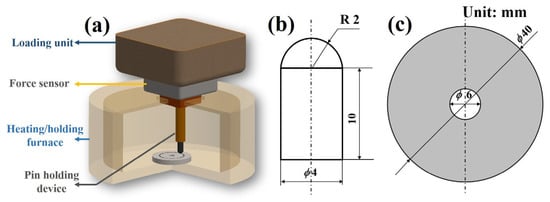 (a) Schematic diagram of high-temperature friction test apparatus, (b) geometry of graphite pin specimen, and (c) geometry of alloy disk specimen.