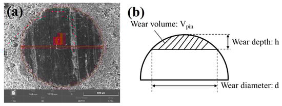 (a) Representative wear scar on the ball of the pin specimen observed via SEM; (b) schematic of the wear volume of the ball head.