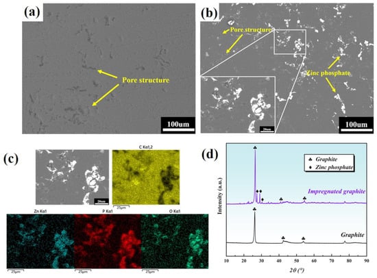 Characterization of surface microstructure: (a) SEM image of the matrix graphite; (b) SEM image of the impregnated graphite; (c) EDS mapping of the impregnated graphite; (d) X-ray diffraction pattern of the matrix graphite and the impregnated graphite.