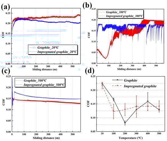 COF as a function of the sliding distance of matrix graphite and impregnated graphite at different temperatures of (a) 20 °C, (b) 300 °C, and (c) 500 °C, and (d): the average COF from 20 °C to 500 °C.