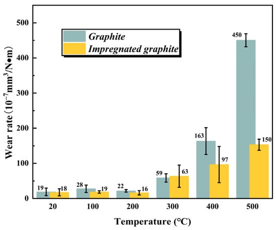 The wear rate of the matrix graphite and the impregnated graphite at different temperatures.