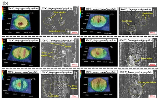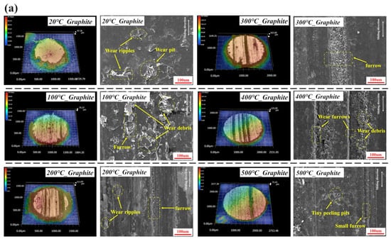 Figure 6 shows the 3D and local SEM wear morphology images of the two types of graphite at different temperatures. At 20 °C, the wear of the matrix graphite and the impregnated graphite is relatively slight, and the worn surface is flat, dominated by wrinkles. With the increase in temperature, the proportion of furrow wear increases. Compared to the matrix graphite, the groove-like damage caused by abrasive wear on impregnated graphite is relatively minor, with surface-localized bulge being the main wear morphological feature. At the same time, there are some wrinkles, spalling, and wear particles of different sizes on the wear scar of both of the two types of graphite. At 500 °C, the number of grooves on the wear scar of the matrix graphite decreases and both the two graphite’s wear morphology are similar, showing slight grooves and spalling pits.