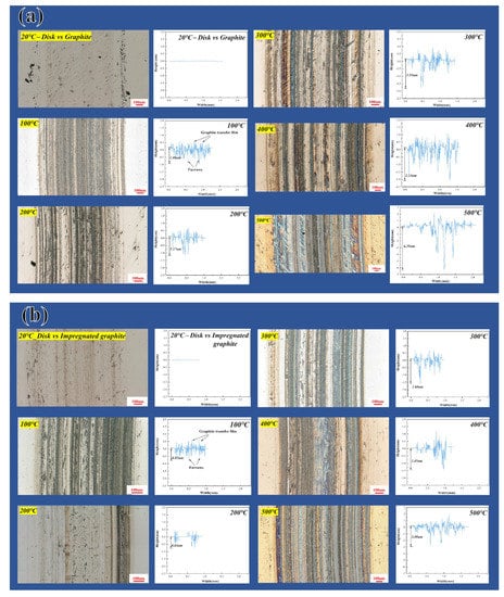 Figure 7 shows the worn surface morphology and the profile curves of the wear track (along the radius of the wear track) of the disk specimens rubbed against the two types of graphite at different temperatures. At 20 °C, the worn surface is very smooth, and there is almost no obvious fluctuation in the profile curve, indicating that the wear of the disk is very slight and approximately negligible. From the beginning at 100 °C, furrow and friction-transferred film appear on the surface, and the relatively amount of the friction-transferred film increases significantly with the increase in temperature. In addition, the fluctuation of the profile curve intensifies significantly with the increase in temperature, which means the wear of the disk is aggravated. Comparing the two types of disk specimens, it is found that the maximum depth of the wear track on the disk specimens paired with the impregnated graphite is significantly smaller than that on the disk paired with the matrix graphite under this condition, as shown in Figure 8.