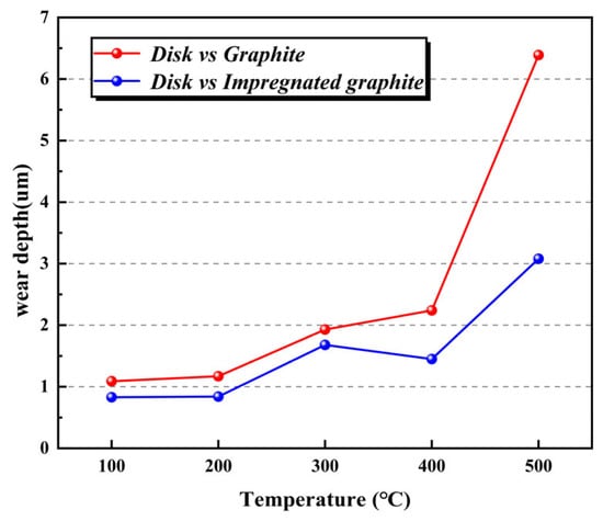 The maximum depth of the wear track of the alloy disk rubbed against matrix graphite and impregnated graphite under different temperatures.